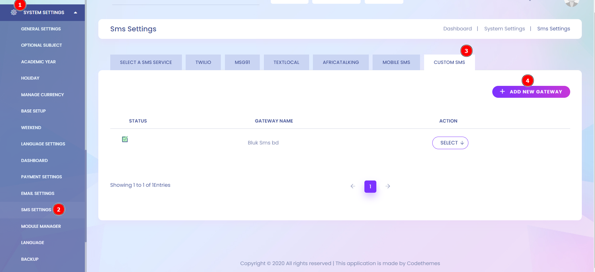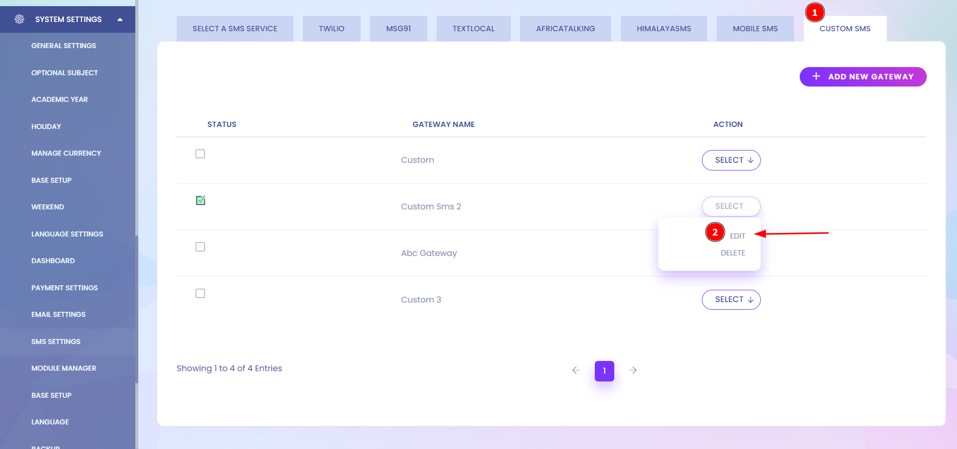 Head over to System Setting (1) then select SMS Setting (2) from the left column. locate Custom SMS (3) Then Click Add New (4) to add new custom SMS settings.