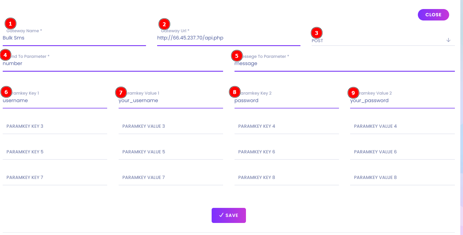 For username we set value parameter key (6) as username and set value of Parameter Value 1 (7) as username of Bulksmsbd. We need to set password and password value as like as username setup (8) and (9) . For Bulksmsbd these setup are enoungh . Hit the save button.