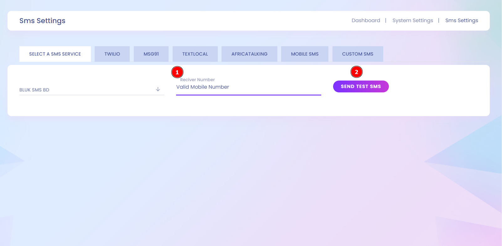 To verify that your SMS setup is working correctly, simply enter a valid mobile number (1) and click Send Test SMS (2). If everything is configured properly, you’ll receive a test message shortly—typically within a minute.