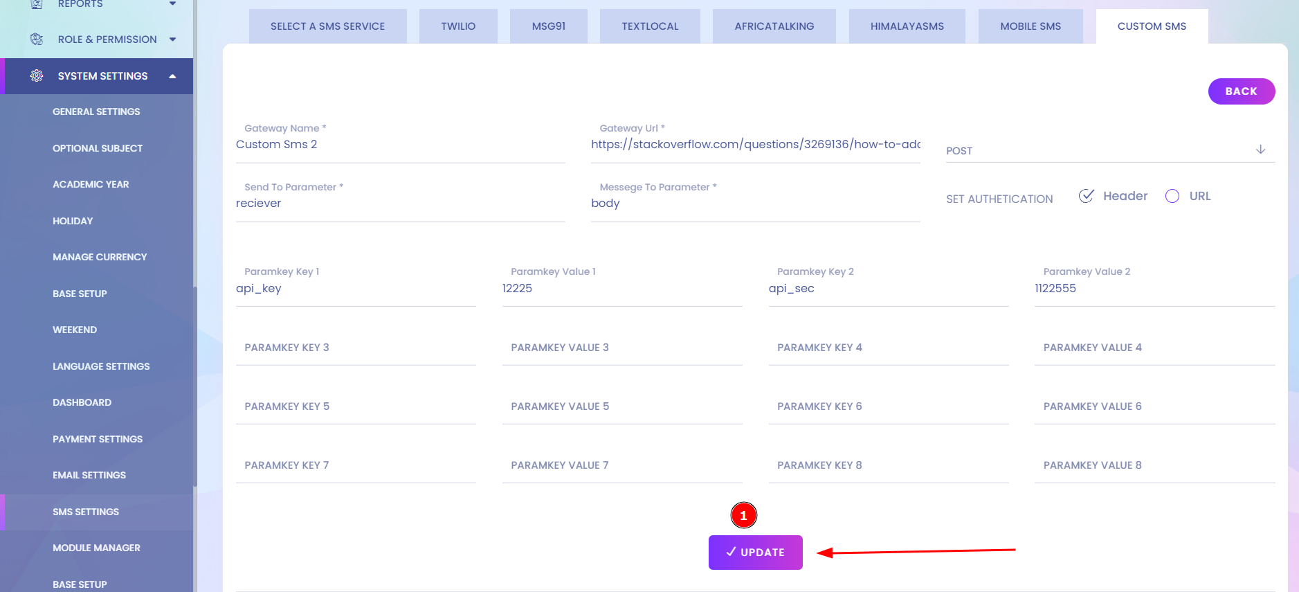 For editing & updating existing custom settings you need to go Custom SMS tab and select the gatway which one you want to modify. click on select and hit Edit(2).